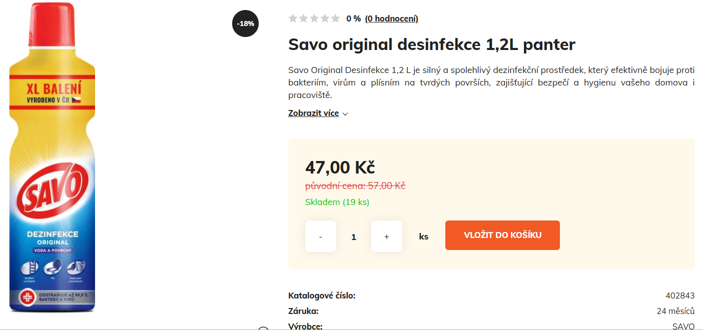 Základem čistoty je Savo Original dezinfekce (1,2 l) – klasika, která spolehlivě zlikviduje bakterie, viry i plísně. Hodí se nejen do koupelny a na toaletu, ale i na dlaždice, pracovní plochy nebo dřez.