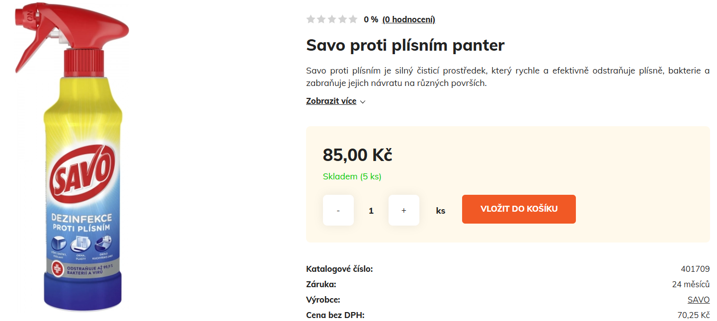 A pokud vás trápí vlhká místa nebo kouty, kde se drží plíseň, mějte vždy po ruce Savo proti plísním – rychle a účinně odstraní i starší nánosy a zamezí jejich návratu.