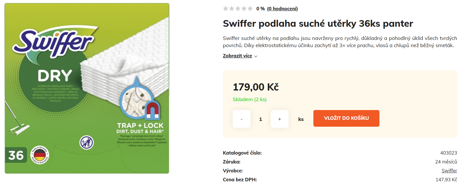 Na běžný prach a drobky se hodí Swiffer podlaha suché utěrky (36 ks) – přitahují prach jako magnet a zanechají podlahu bez šmouh.