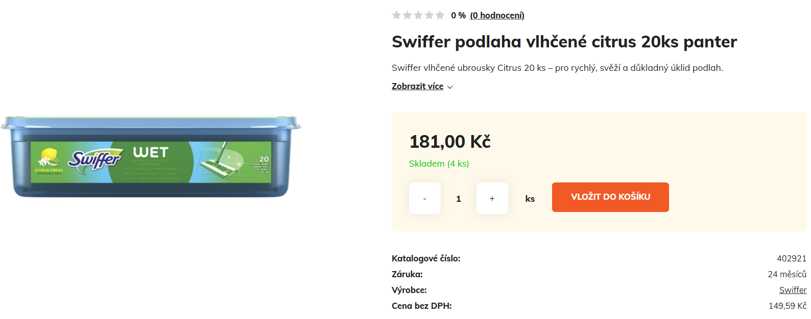 Když je potřeba hloubkové čištění, stačí vyměnit utěrky za Swiffer podlaha vlhčené citrus (20 ks) – krásně voní, osvěžují a odstraní i zaschlou špínu.
